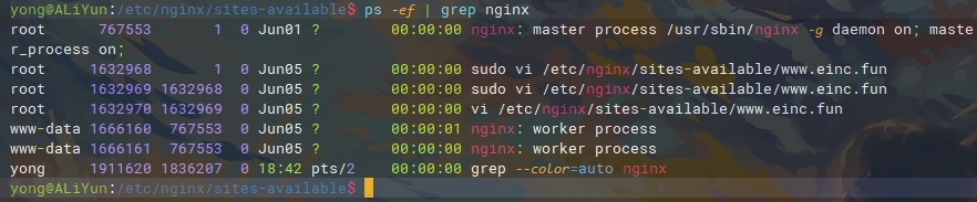 在命令行中可以使用ps -ef | grep nginx来查看nginx的进程
